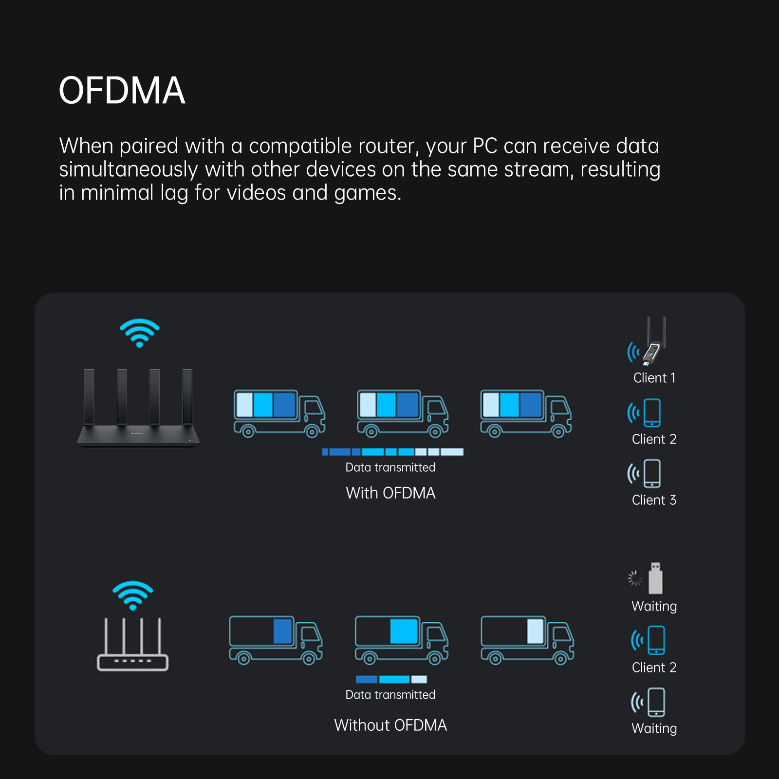 Când este asociat cu un router compatibil, PC-ul poate primi date simultan cu alte dispozitive de pe același flux, rezultând o întârziere minimă pentru video și jocuri.