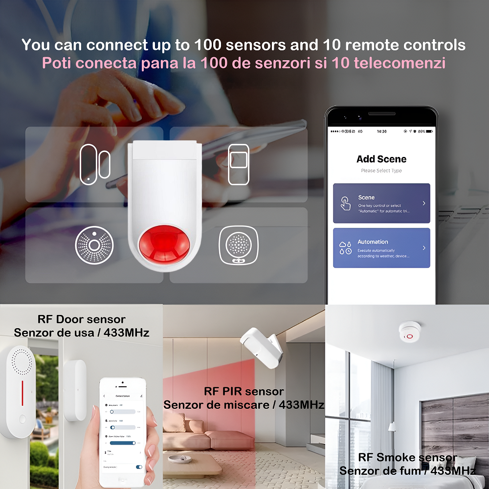 Poate fi folosit integrat intr-un sistem de alarma, cod de invatare 1527 sau cu un Hub/Sirena TuyaSmart/SmartLife App ori independent.